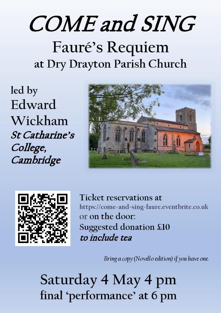 Calling all singers! A chance to enjoy Faure’s beautiful Requiem in an informal, Come and Sing session directed by Dr Edward Wickham (Director of Music at St Catharine’s College, Cambridge).