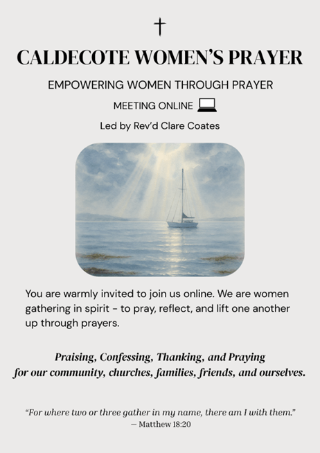 Caldecote Women’s Prayer group Thursday mornings in term time at 9am on Zoom Women from Caldecote and surrounding villages are warmly invited to join us online, gathering in spirit to pray, reflect and lift one another up through prayers. https://us02web.zoom.us/j/88137270141?pwd=pCvjk7eQrFqYX8GrvRP6JmMZKI9bYK.1